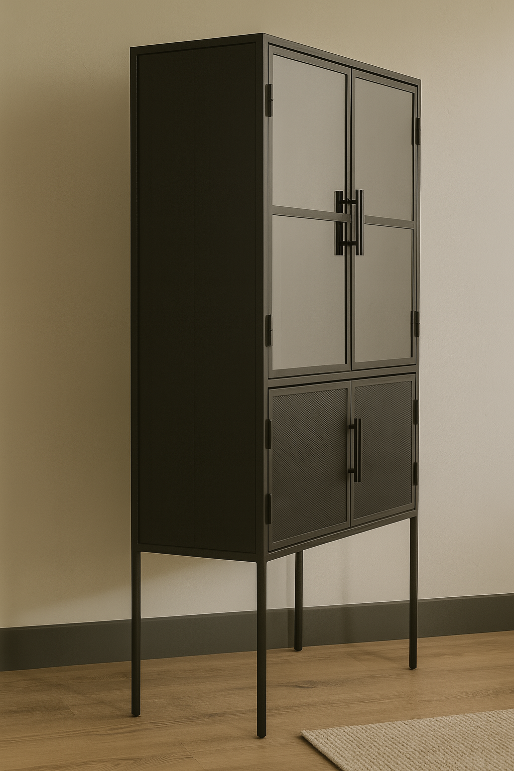Vitrina de fierro y vidrio. Elegante y funcional, esta vitrina de fierro combina estructura liviana con carácter industrial. Con puertas de vidrio y zona inferior en malla metálica, permite exhibir objetos con orden y estilo. Ideal para vajilla, copas o decoración. Copero incorporado.