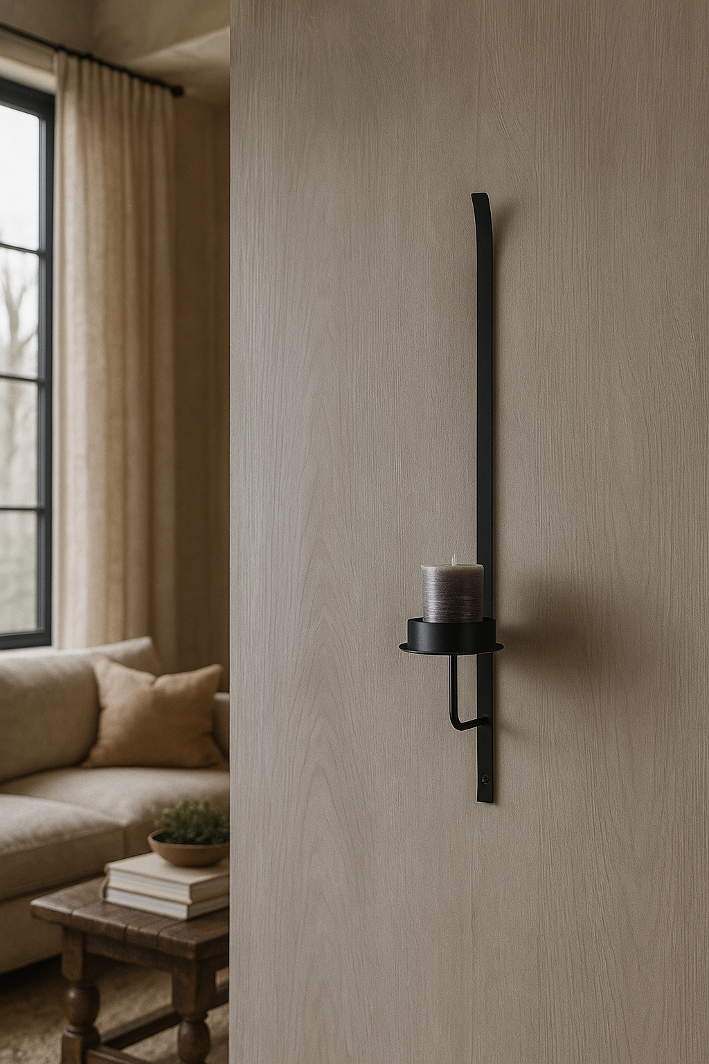 Candelabro de muro terminado en punta. Tiene una presencia escultórica, atemporal y elegante. La estructura tiene 12x12xh:64 cm y el ancho interno de la base: 10 cm.